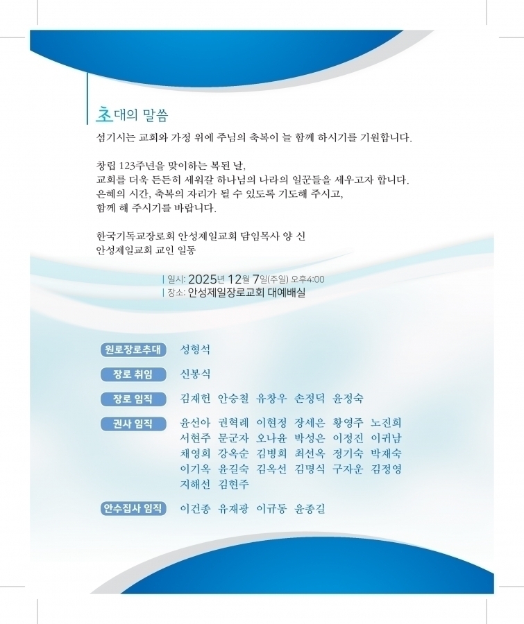 안성제일교회(양신목사 사무) 원로장로추대 및 장로취임, 장로,권사,안수집사 임직예배에 노회원들을 정중히 초대합니다.