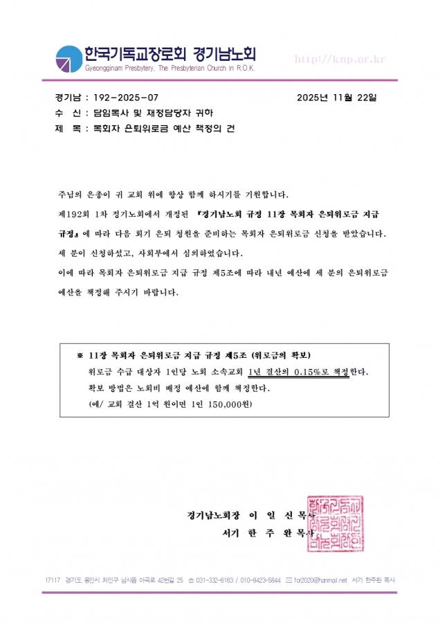아무쪼록 새롭게 시작되는 은퇴위로금 방식에 차질이 없도록 노회원들의 많은 관심과 협조를 부탁드립니다.