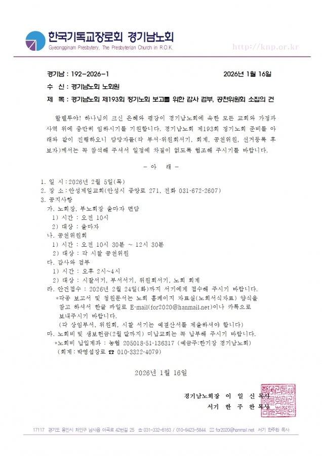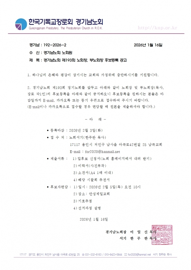[노회서기부] 감사,검부,공천위원회, (부)노회장 후보 등록, 면담 공지