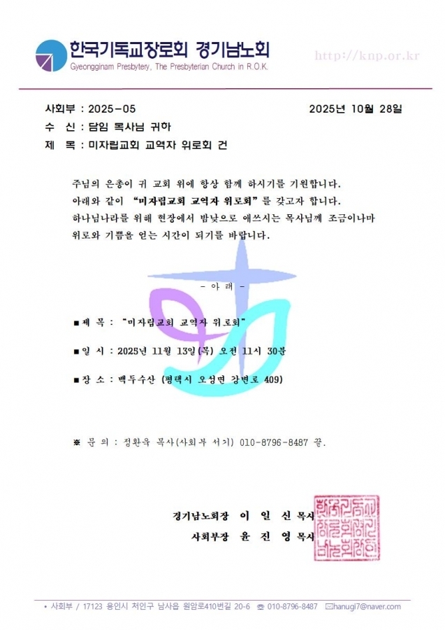 사회부에서 알려드립니다!아래(공문)와 같이 미자립교회 교역자 위로회를 실시합니다.11월 13일(목)입니다. 참석 가능하신 분은 먼저 저에게 알려주시면 준비하는데 큰 도움이 되겠습니다.감사합니다~^^