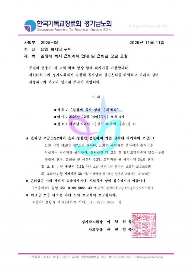 김창배 목사님 은퇴예식 및 은퇴금 모금 요청 안내 공문입니다.