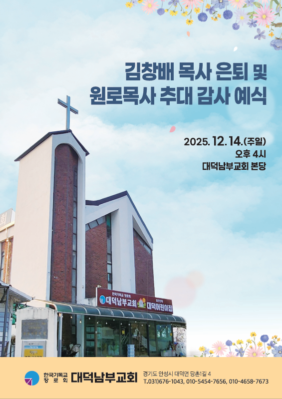 대덕남부교회 김창배목사님의 은퇴 및 원로목사 추대 감사예식에 노회원들을 정중히 초대합니다.