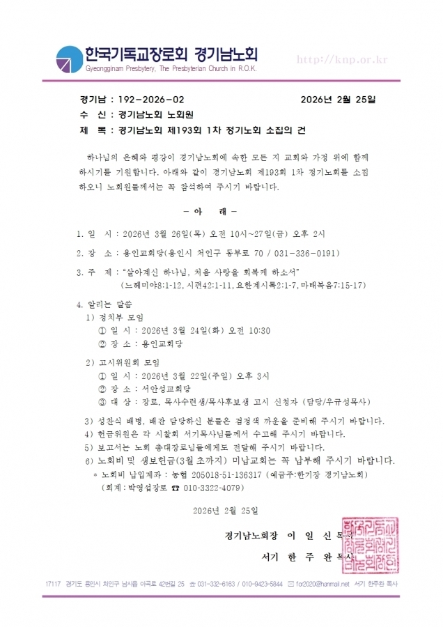 제193회기 1차 정기노회 소집 공고합니다.